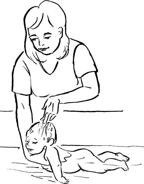 При заходе на четвертую «восьмерку» в положении лежа на животе, удерживая голову ребенка левой рукой, правой наберите воды в ладонь правой руки и, говоря «ныряем», налейте ее на пограничную область волос и лба. При этом малыш должен закрыть глаза и задержать дыхание (рис. 439).