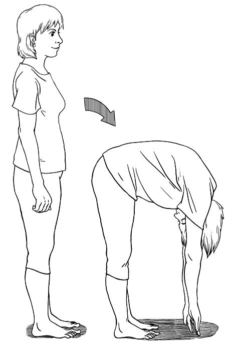 Наклонитесь вперед, коснитесь пальцами пола. Через два месяца занятий вы сможете касаться пола уже всей ладонью. Голову наклоняйте вместе с туловищем.