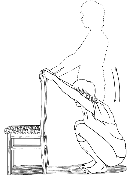 Выполните приседания, держась руками за спинку стула.