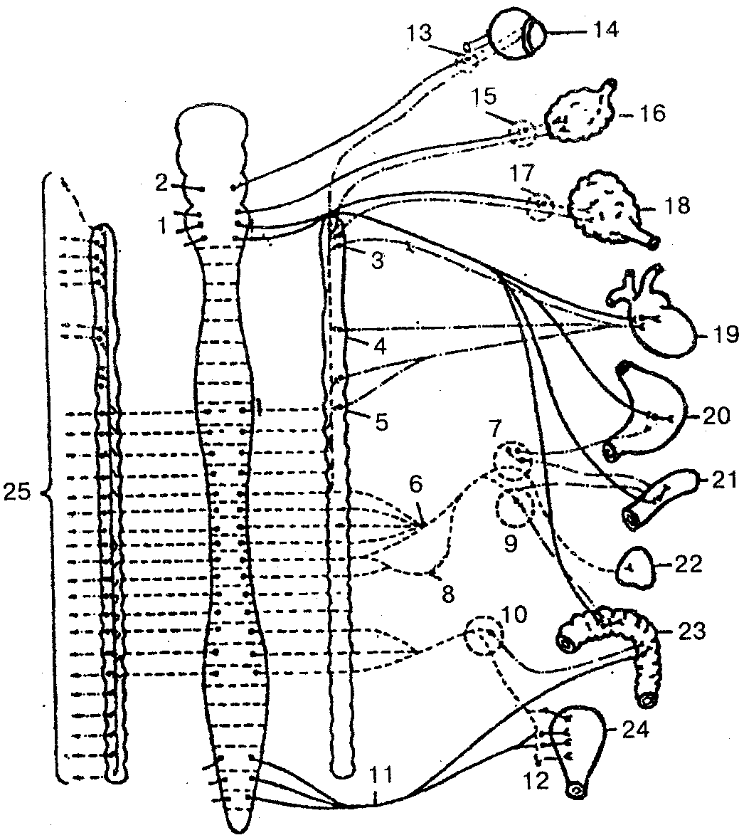 I — продолговатый и задний мозг; 2 — средний мозг; 3 — верхний шейный мозг; 4 — средний шейный узел; 5 — шейно-грудной (звездчатый) узел; 6 — большой внутренностный нерв; 7— чревный нерв; 8— малый внутренно-стный нерв; 9 — верхний брыжеечный узел; 10 — нижний брыжеечный узел; II — тазовый внутренностный нерв; 12 — мочепузырное сплетение; 13 — ресничный узел; 14—глаз; 15 — поднижнечелюстной узел; 16— поднижнечелюстная железа; 17— ушной узел; 18 — околоушная железа; 19— сер-дце; 20 — желудок; 21 — тонкая кишка; 22 — надпочечник; 23 — толстая кишка; 24 — мочевой пузырь; 25 — ветви к сосудам, мышечным волокнам и железам кожи