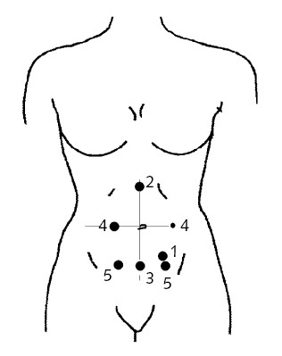4. Симметричные точки (5), расположенные на самой высокой области живота. На 3 пальца кнаружи и на 3 пальца ниже пупка.