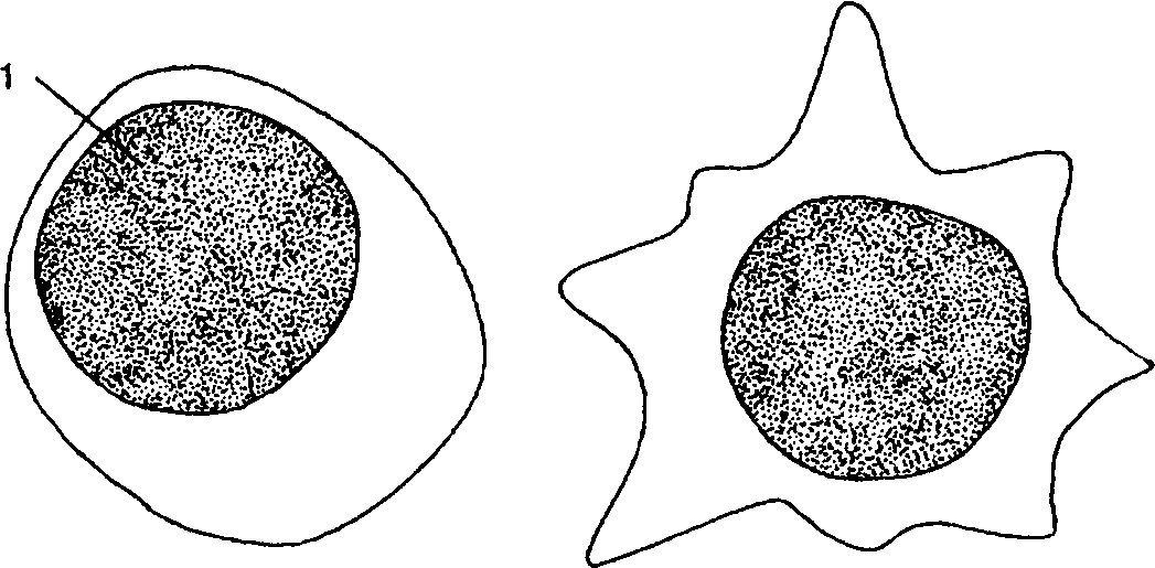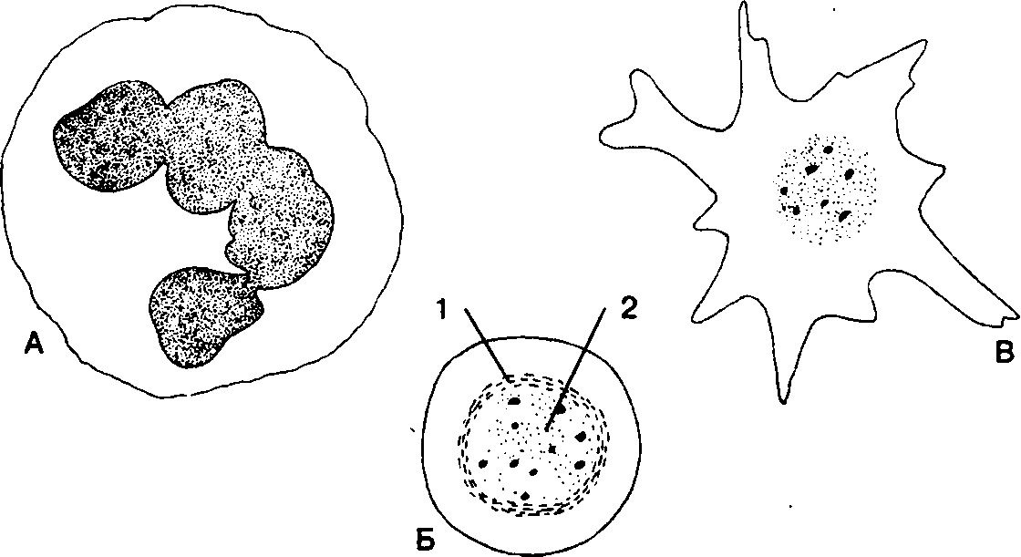 Мегакариоцит и тромбоцитарные пластинки: А – мегакариоцит; Б – неактивированные тромбоцитарные пластинки; В – активированные тромбоцитарные пластинки. 1 – кольцо микротрубочек; 2 – центральная часть клетки с митохондриями, гранулами и т. п. Тромбоцитарные пластинки отделяются от краев мегакариоцита, при активации микротрубочки формируют тяжи , обеспечивающие