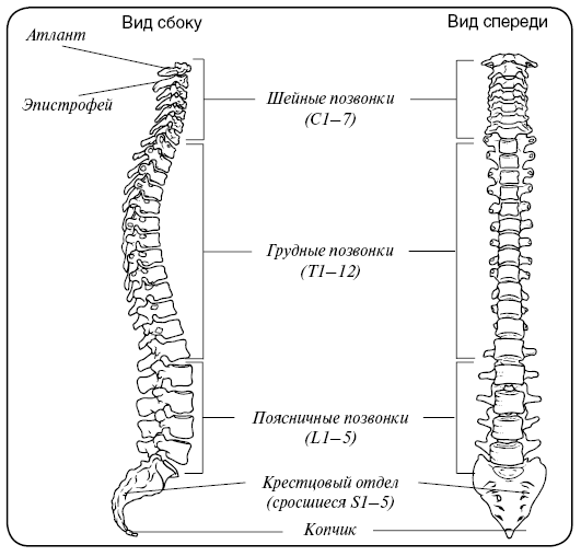 Позвоночник имеет несколько отделов – шейный, грудной, поясничный, крестцовый и копчик. Каждый из них включает в себя определенное количество позвонков: