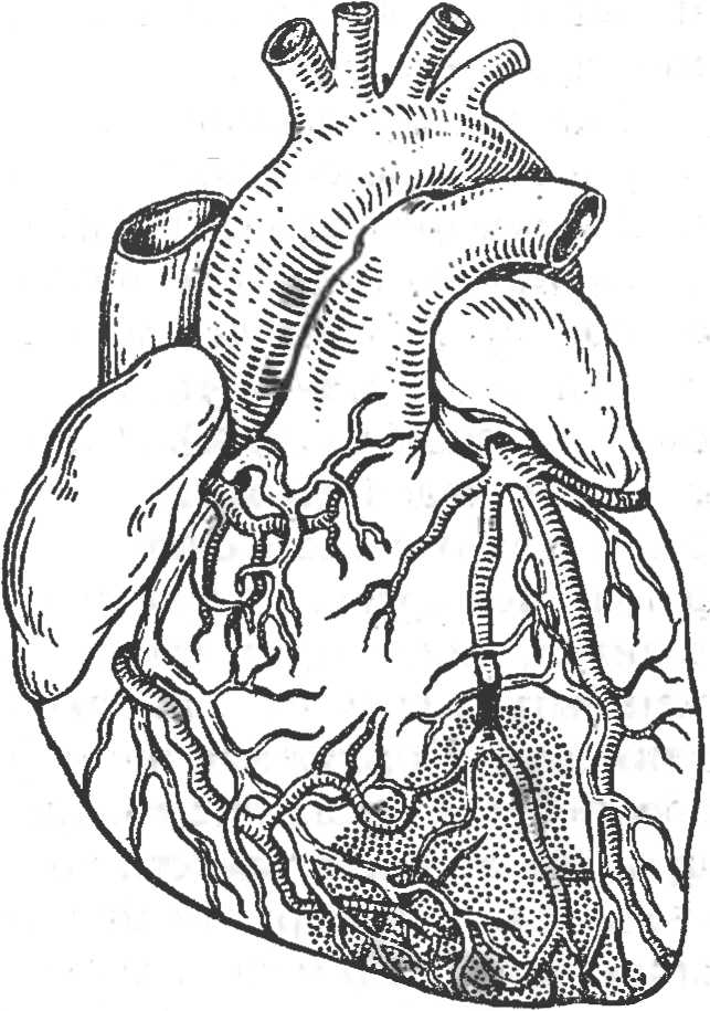 Рис. 64. Инфаркт миокарда. Черным показана закупорка (тромбоз) артерий, зона некроза заштрихована.