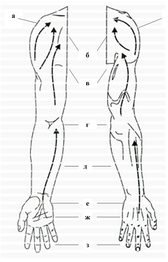 а) плечевой сустав, б) дельтовидная мышца, в) внутренняя и наружная поверхности плеча, г) локтевой сустав, д) внутренняя и наружная поверхности предплечья, е) лучезапястный сустав, ж) тыльная и ладонная поверхность кисти, з) пальцы кисти