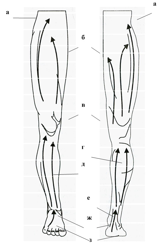 Рис. 2. Направление массажных линий на нижних конечностях.