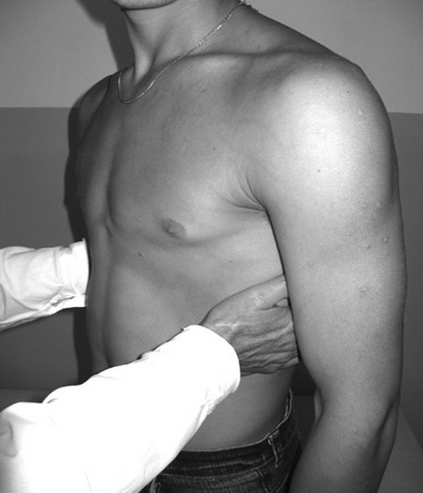 Пальпацию грудной клетки с целью выявления болевых точек производят кончиками пальцев на симметричных участках, надавливая на грудную клетку в определенной последовательности. Спереди начинают с надключичных и подключичных областей, затем области больших грудных мышц, нижнелатеральных отделов грудной клетки, по аксиллярным линиям сверху вниз; сзади начинают с надостных областей, переходят на межлопаточную область лопатки, подлопаточные зоны, заднелатеральные отделы грудной клетки.