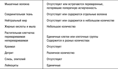 Для диагноза важно наличие в каловых массах остатков тех продуктов, которые должны перевариваться без остатка: соединительная и мышечная ткани, жир и т. д.
