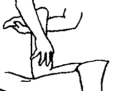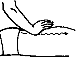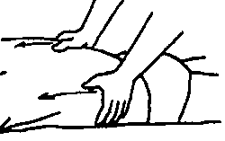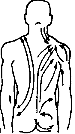 Поглаживание крупных мышц (передняя и задняя поверхности бедра, ягодичные мышцы и мышцы спины) одной рукой выполняют в два или три приема. Так, при поглаживании мышцы бедра сначала проводят по внутренней поверхности бедра, затем по центральной и по наружной. Так повторяют несколько раз. При поглаживании мышц бедра и ягодичных мышц внутреннюю поверхность нужно массировать осторожно или не массировать совсем во избежание раздражения половых рецепторов. Поглаживание мышц спины см. на рис. 6.