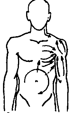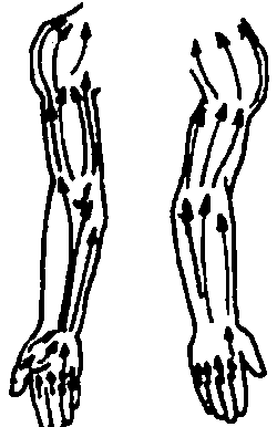Направление движения руки массажиста соответствует направлению тока венозной крови и лимфы от периферии к центру до ближайшего лимфатического узла (рис. 18).