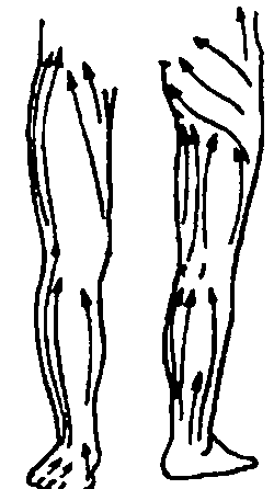 1. Рука массажиста должна передвигаться вдоль кровеносных сосудов по направлению тока венозной крови и лимфы к ближайшему лимфатическому узлу (рис. 1) от периферии к центру.