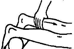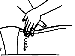 Поглаживание одной рукой. Этот прием наиболее прост и выполняется следующим образом. Кисть руки массажиста с плотно сомкнутыми четырьмя пальцами обхватывают мышцу в поперечном направлении, в дистальном ее отделе (например, при поглаживании икроножной мышцы накладывается на ахиллово сухожилие), и лежит так, что указательный и большой пальцы находятся в направлении движения руки (рис. 5). Затем рука от дистального конца мышцы (от пятки) свободно скользит вдоль мышцы к подколенной ямке, т. е. к ближайшему лимфатическому узлу. После этого рука отрывается и движение повторяется. Аналогичным образом поглаживаются все мышцы, которые можно полностью обхватить рукой.