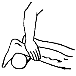 Массажист обеими руками плотно обхватывает массируемую мышцу в ее начале (рис. 20) и начинает поочередные круговые движения с продвижением вперед. При этом важно, чтобы мышца не выскальзывала из руки и движения были не резкими перехватывающими, а скользящими. Иными словами, руки двигаются так, чтобы межтканевая жидкость могла продвигаться только в одном направлении — от периферии к центру. Во время разминания нужно следить, чтобы руки не расходились слишком далеко одна от другой.