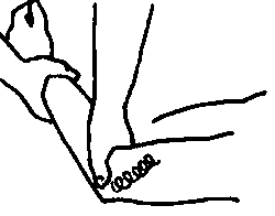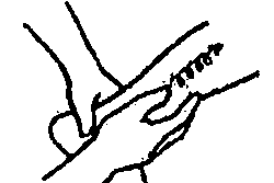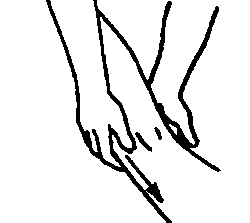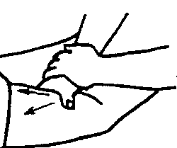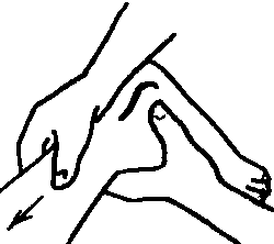 Щипцеобразное растирание. Пальцы рук массажиста принимают форму «щипцов», т. е. большой и остальные четыре пальца выпрямляют параллельно друг другу. В таком положении их накладывают на сухожилие и производят продольные или поперечные движения с продвижением руки вдоль или поперек сухожилий (рис. 13). Если этот прием выполняется на коленном или локтевом суставах, его называют аркой (И. М. Саркизов-Серазини, 1953).