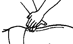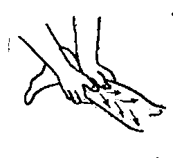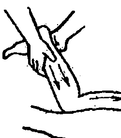 Поглаживание двумя руками. Этот прием также не вызывает особых трудностей и выполняется следующим образом. При попеременном поглаживании кисти рук накладывают на мышцу, как при поглаживании одной рукой, только попеременно.