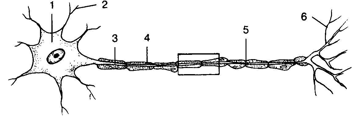 Нервная клетка: 1 – тело клетки; 2 – дендриты (отростки , по которым импульс идет к клетке); 3 – аксон (отросток , по которому импульс идёт от клетки); 4 – миелиновая оболочка;5 – перехваты Ранвье; 6 – разветвления аксона