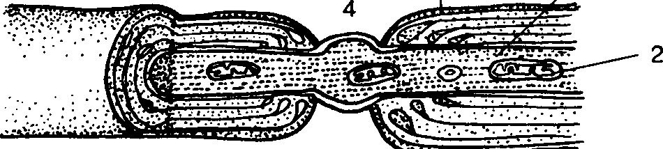 Перехват. Ранвье при увеличении: 1 – аксон; 2 – митохондрия; 3 – миелиновая оболочка , образованная шванновской клеткой; 4 – перехват Ранвье