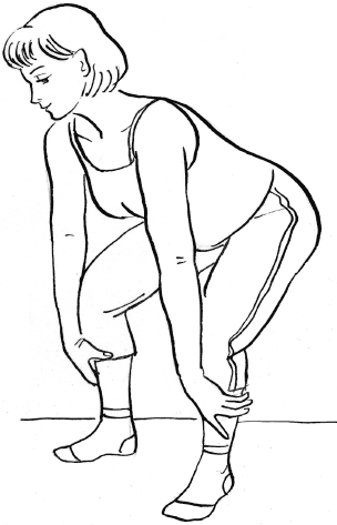 1. Присаживайтесь вниз с опорой на всю стопу, ноги, согнутые в коленях, разведены, локти находятся поверх коленей, кисти удерживают лодыжки (рис. 56).