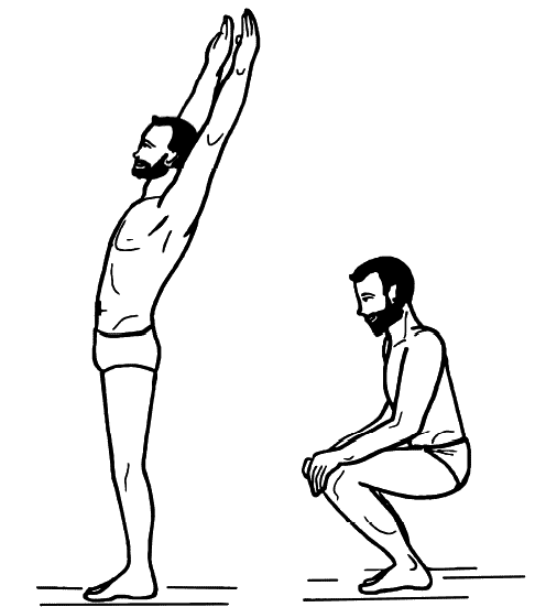 2. При вдохе руки поднять вверх, прогнуться, при выдохе присесть, положив кисти рук на колени.
