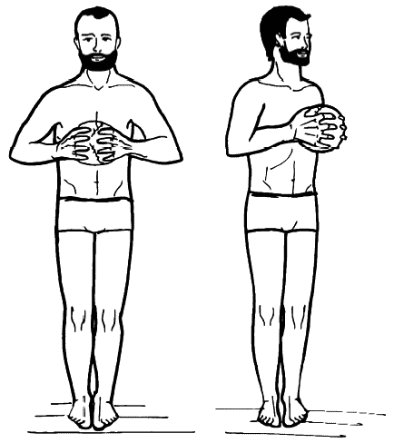 4. Взять в руки тяжелый мяч, поставить руки на уровне груди. При вдохе повернуться в сторону, при выдохе вернуться в исходное положение.