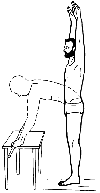 6. Положить палку на стул. При вдохе поднять руки вверх, при выдохе наклониться, взять палку в руки. Выполнить 5–6 раз.