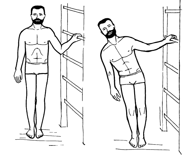 7. Встать боком к гимнастической стенке. Положить руку на перекладину на уровне груди. При вдохе отклониться от стенки, при выдохе вернуться в исходное положение.