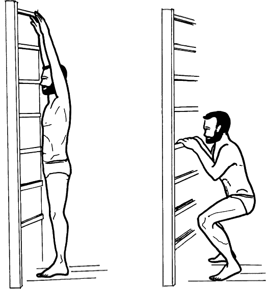 8. Встать лицом к гимнастической стенке. При вдохе поднять руки вверх, постараться дотянуться руками до верхней планки, при выдохе, держась за перекладину на уровне пояса, сделать легкое приседание.