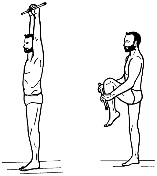 9. Взять в руки гимнастическую палку, руки опустить. При вдохе поднять руки вверх, при выдохе с помощью палки подтянуть колени к животу.