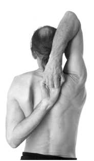 2. Правую руку заведите за голову ладонью к спине и сцепите пальцы правой и левой рук.