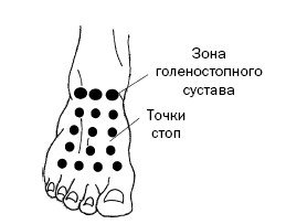 В области голеностопного сустава надавливаем всего 3 точки, расположенные в месте сочленения голени и стопы между наружной и внутренней поверхностью лодыжек (рис. 45, д).