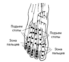 На тыле стопы выделяют 16 точек, они расположены в 4 параллельных рядах по 4 точки в каждом (рис. 45, д, е). Почему так? Потому что у нас 5 пальцев и, соответственно, 4 межпальцевых борозды. Мы надавливаем не на костные фаланги, а на точки, расположенные в промежутках между костной системой.