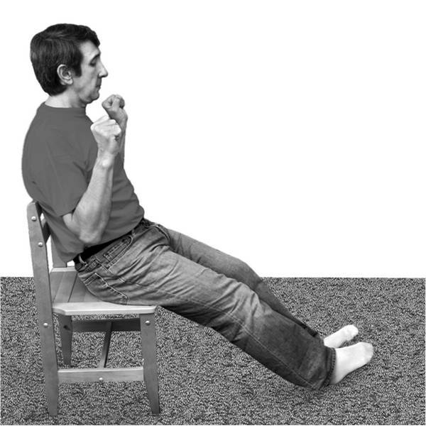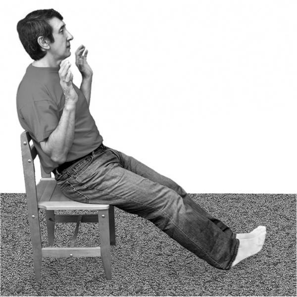 Исходное положение: сядьте на стул. Руки держите на уровне груди рядом с телом, ладонями к зрителю, локти опустите. Ноги вытяните прямо перед собой, слегка согнув в коленях, пятками упритесь в пол.