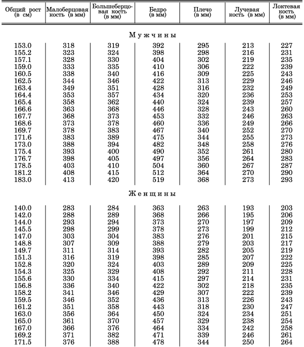 В пособиях по антропологии и судебной медицине даются готовые расчеты, где указываются общий рост и соответствующий ему наибольший размер длинных трубчатых костей у взрослых мужчин и женщин, жителей Европы (табл. 1).