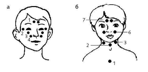 Основные точки профилактики простуды расположены на лице. Ребенок должен надавливать на симметричные точки кончиками указательных пальцев в течение нескольких секунд (в идеале 15–20 секунд). Устанавливаем пальчики последовательно в точки 1 ? 2 ? 3 ? 4, надавливаем и одновременно вращаем кожу, будто неспешно «вкручиваем болтики». Это самый простой массаж по сокращенной схеме.