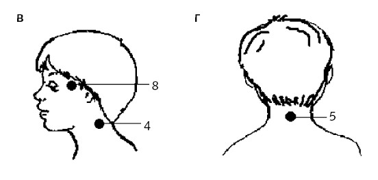 Рис. 33, а, б, в, г, д. Точки ежедневной профилактики простуды