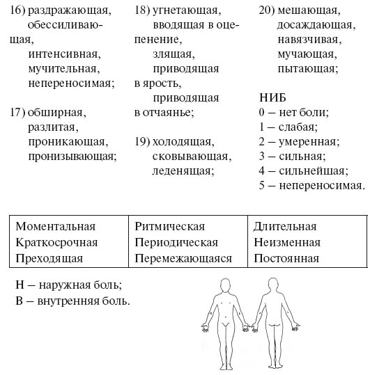 Прилагательные, описывающие болевой синдром, разделены на 4 основные группы: