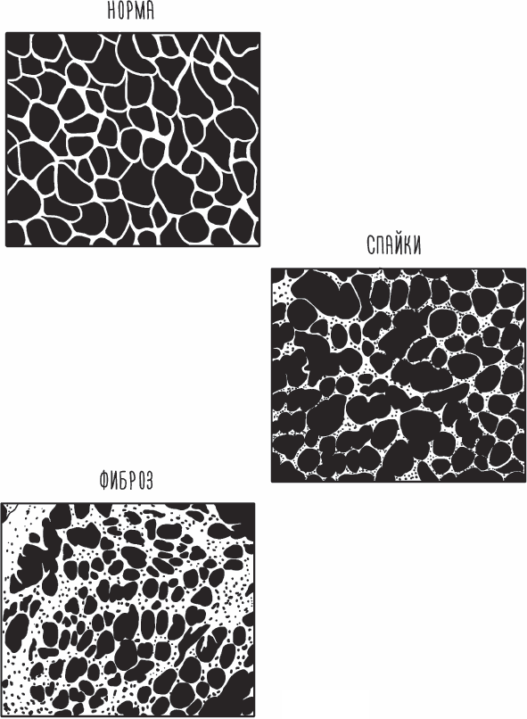 Таких измененных мышечных волокон, уже не способных к полноценному усилию, становится все больше с каждым годом, если не происходит восстановления тонуса мышцы. Снижается общее количество мышечной ткани в мышцах, происходит замена мышечных волокон соединительнотканными прослойками (спаечный процесс), а затем и коллагеновыми волокнами, которые становятся все более плотными и грубыми с возрастом, – это уже процесс фиброзирования (см. рис. 5).
