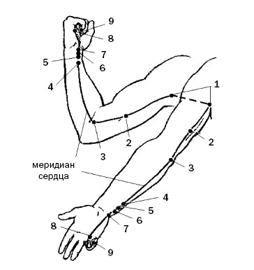 Главные точки меридиана: возбуждающая точка – 9 Шао-чун, успокаивающая точка – 7 Шэнь-мэнь, противоболевая точка – 6 Инь-си.