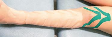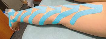 Техника наложения: фасциальная коррекция, «голова барана», все тейпы наложены с осцилляцией и натяжением 20 % на переднюю и заднюю поверхность бедра и голени.