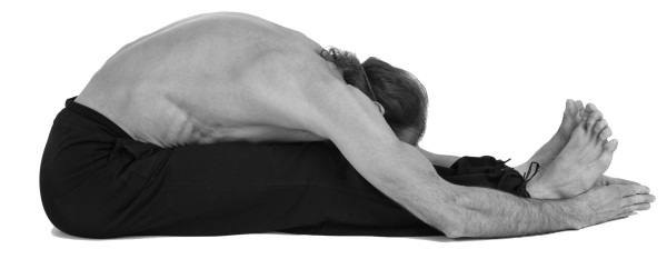 Медленно, без рывков, наклонитесь вперед, вытяните руки и тяните туловище вперед, стараясь при этом прижать лоб к коленям и достать ладонями пальцы ног.