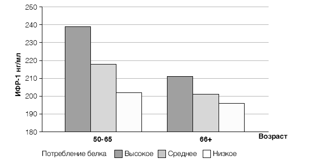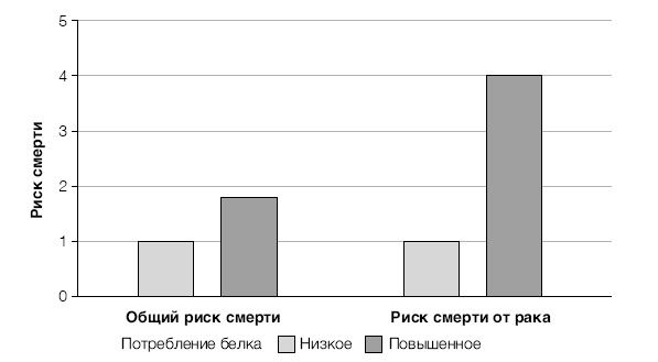 По результатам исследования, проведенного в Гарварде при участии 100 тысяч врачей и медсестер, выяснилось, что низкоуглеводная диета, богатая животными жирами и белком, увеличивает смертность как общую, так и по причине развития рака и сердечно-сосудистых заболеваний, что полностью совпадает с нашими результатами [11]. В ходе другого похожего исследования при участии 40 тысяч мужчин оказалось, что питание с низким содержанием углеводов и богатое животным белком вдвое увеличивает риск возникновения диабета [12]. Более того, при высоком уровне ИФР-1 в крови риск заболеть раком груди, простаты и другими болезнями возрастает еще больше [13].