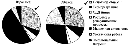 Рис. 13. Структура суточных энергозатрат взрослого и ребенка (от знака ? по часовой стрелке)