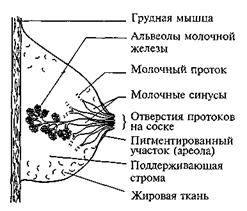 Рис. 14. Упрощенная схема строения женской груди. Видны дольки, где секретируется молоко, а также протоки и синусы по которым молоко направляется к соску