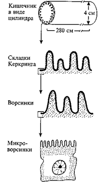 Кишечное пищеварение. В тонком кишечнике продолжается процесс переваривания пищи, причем здесь же и происходит всасывание многих продуктов гидролиза белков, жиров и углеводов. Этому способствует анатомическое устройство кишечника (рис. 15). У взрослого человека внутренняя поверхность кишки имеет многочисленные складки и достигает 0,7 м2. При этом на каждом квадратном сантиметре поверхности находится 2–3 тыс. ворсинок, которые увеличивают площадь поверхности до 4–5 м2, что в 2–3 раза превышает поверхность тела человека. Каждая из ворсинок покрыта еще множеством микроворсинок, что многократно увеличивает общую поверхность всасывания. С возрастом существенно изменяется анатомическая длина тонкого и толстого кишечника, а также относительные величины этих показателей. Наиболее интересны изменения длины кишечника по отношению к длине туловища: максимальная величина этого показателя регистрируется у детей 1–4 лет, т. е. в период перехода на смешанное и взрослое питание. В этот же возрастной период у детей наиболее развито пристеночное пищеварение, для которого важна площадь внутренней поверхности тонкой кишки. Относительная длина толстого кишечника в отличие от таковой тонкого кишечника продолжает увеличиваться у детей вплоть до достижения ими взрослости, что, вероятно, связано с увеличением грубых, трудно перевариваемых видов пищи в рационе человека с возрастом.