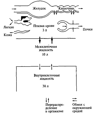 Рис. 17. Схема жидкостных пространств организма. Представлены округленные значения для человека массой 70 кг