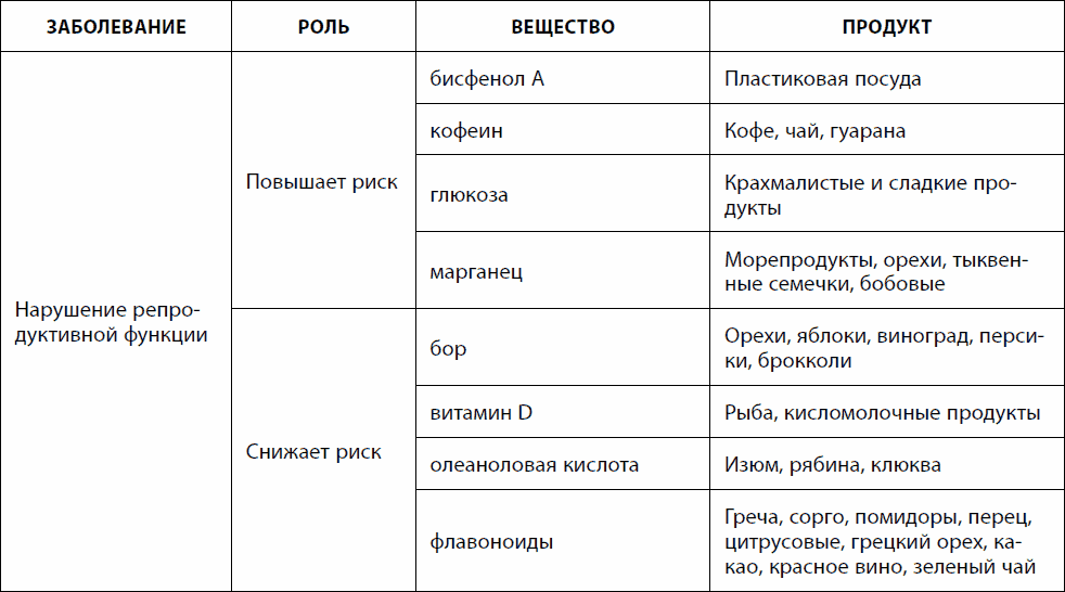 Во многих странах для стимулирования роста крупного рогатого скота применяют анаболические половые стероиды. Как было показано на примере американцев, употребление продуктов питания из красного мяса приводит к уменьшению общего количества сперматозоидов. Мужчины, которые выпивают две или больше чашек крепкого кофе в день, имеют повышенный риск бесплодия. Аналогичное действие оказывает курение. Напротив, умеренное потребление алкоголя (эквивалентное 22 г чистого спирта в день) улучшает мужскую репродуктивную функцию. Это связано с тем, что умеренные количества алкоголя увеличивают концентрацию тестостерона в крови и уменьшают уровень стресса. Диета, содержащая в достаточном количестве углеводы, клетчатку, фолиевую кислоту и ликопин, то есть богатая овощами и фруктами, способствует улучшению качества спермы. Снижение употребления животных белков и жиров также оказалось полезным для фертильности. Достаточное количество витамина Е улучшало подвижность сперматозоидов и на 20 % увеличивало шансы зачатия (табл. 20).