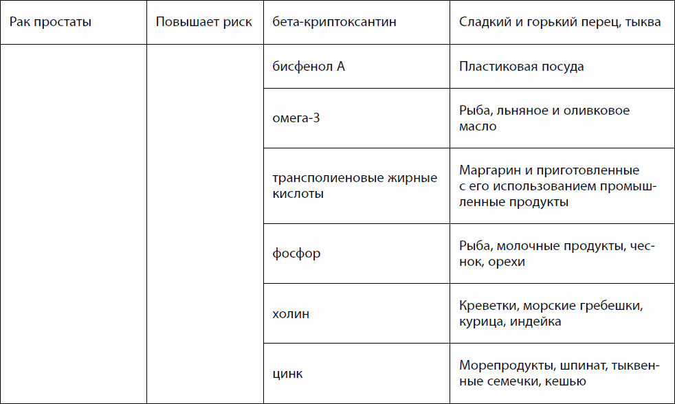 Рак простаты относится к лидирующим причинам смерти мужчин в развитых странах. Предполагают, что немаловажным фактором риска является так называемая «западная диета». Кроме того, исследования подтверждают негативную роль молочных и других продуктов с большим количеством животного белка, а также избытка кальция из молочных продуктов. Напротив, ограничение избыточного потребления углеводов, соевые продукты, гранат, зеленый чай, помидоры и томатные продукты (содержат каротиноид ликопин), как показали некоторые исследования, могут сыграть профилактическую роль.