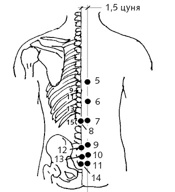 7. Шэнь-шу («почка, точки спины») расположена на 1,5 цуня вправо от остистого отростка 2-го поясничного позвонка, «на поясе».