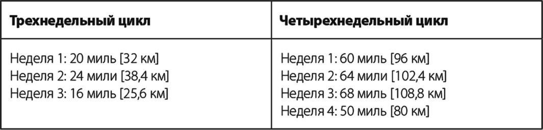 Ниже я привожу пример того, как общий объем бега может быть распределен в случае с трех– и четырехнедельным циклами.