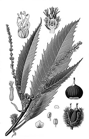 Каштан посевной — Castanea sativa L. — обладает самыми вкусными в этом семействе плодами. Это дерево, достигающее 30-м высоты, растет на Кавказе в широколиственных лесах. Кожистая колючая обертка-плюска заключает в себе один-три ореха с кожистым околоплодником, которые съедобны в вареном, печеном виде и размолотые в муку.